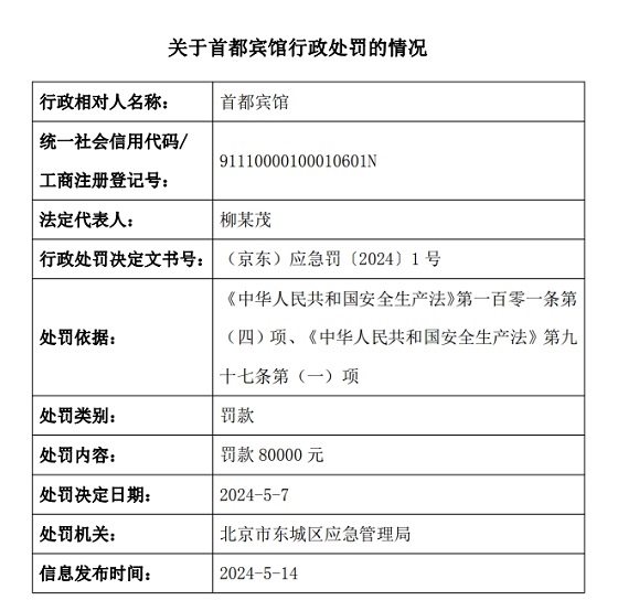 中国网财经5月15日讯 北京市东城区人民政府官网显示,2024年5月,东城区应急管理局对首都宾馆行政处罚,处罚内容为罚款8万元。