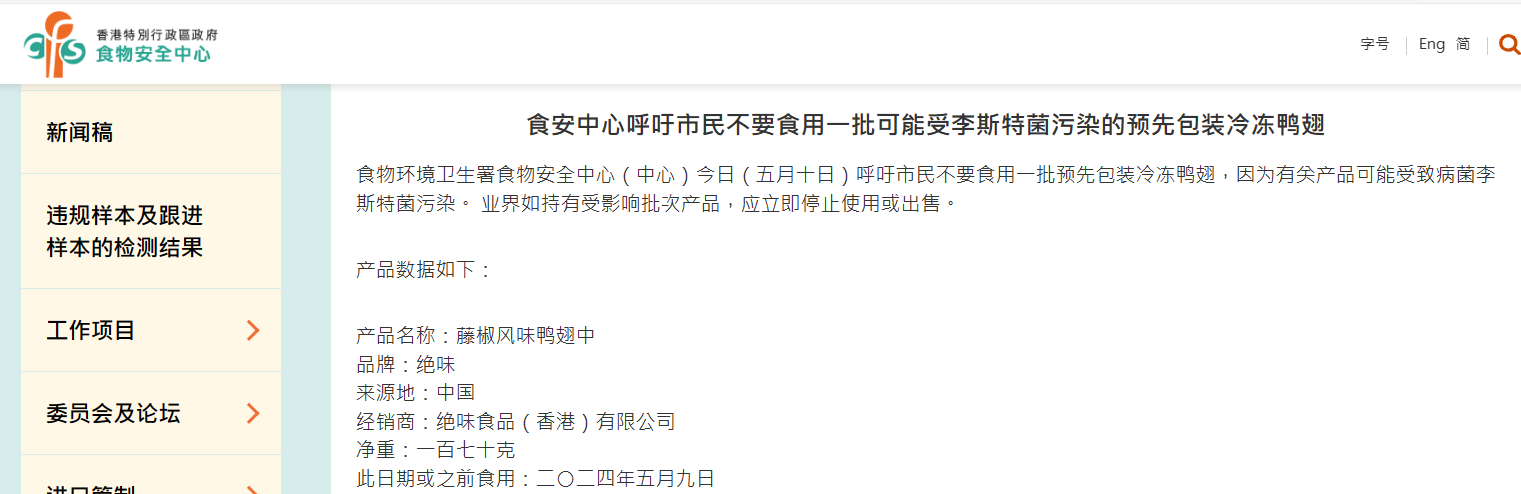 未来网北京5月15日电(记者谢青)近日,香港食物环境卫生署食物安全中心发布公告称,绝味食品(香港)有限公司(以下简称“绝味香港公司”)销售的一批鸭翅中可能受致病菌李斯特菌污染,要求停售及下架相关产品。据专家介绍称,如果食用被李斯特菌污染的食物,可能会出现恶心、呕吐、腹泻、头痛、便秘及持续发烧等症状,需及时就医诊治。