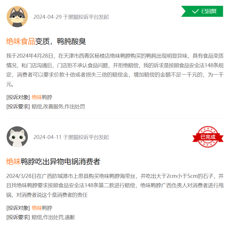 当前,绝味食品陷入食品安全问题,同时记者在黑猫投诉平台注意到,有多条涉及“绝味鸭脖”相关产品的投诉,涉及变质、吃出异物、日期有异样等问题。
