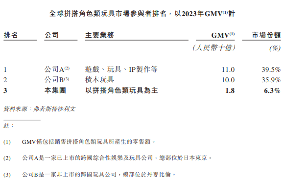 在招股书中,布鲁可援引弗若斯特沙利文数据称,根据2023年GMV(即“商品交易总额”)计算,公司为中国最大、全球排名第三的拼搭角色类玩具企业。
