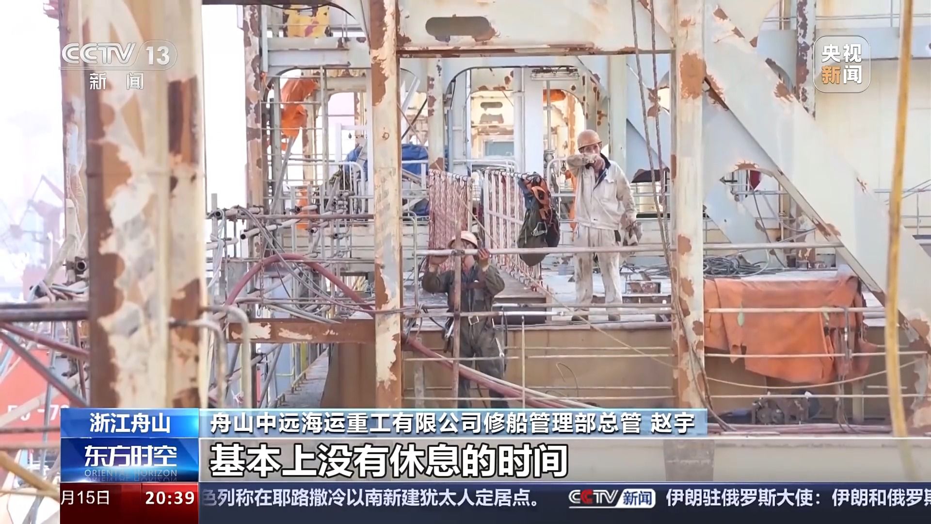舟山中远海运重工有限公司修船管理部总管赵宇:到目前为止,我个人负责的船只,走一条来一条,基本上没有休息的时间。对公司来说业务增加了、效益好了,那对我们个人来说,个人的钱包就鼓了。