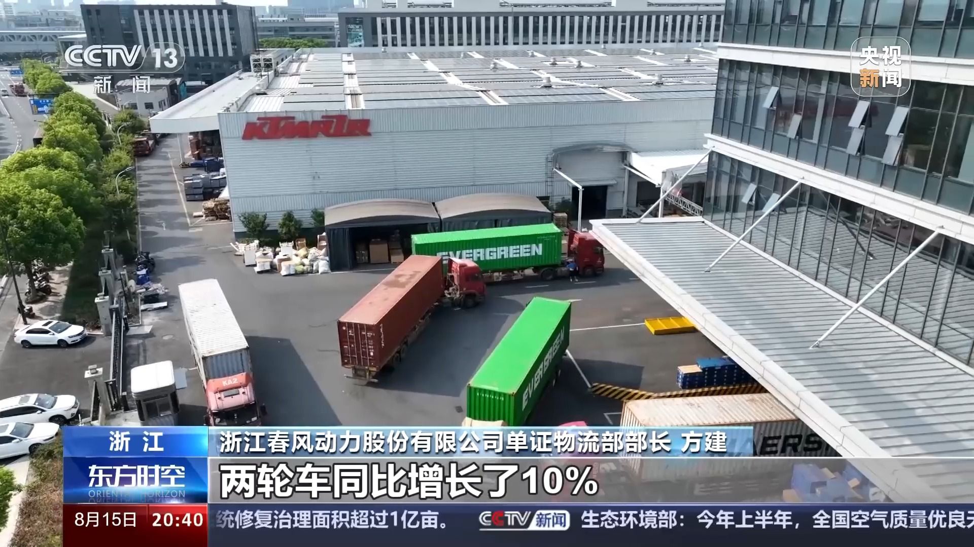 浙江春风动力股份有限公司单证物流部部长方建:上半年我们出口四轮车同比增长了40%,两轮车同比增长了10%,然后集装箱大概出运了7700个大柜,同比增长了27%。