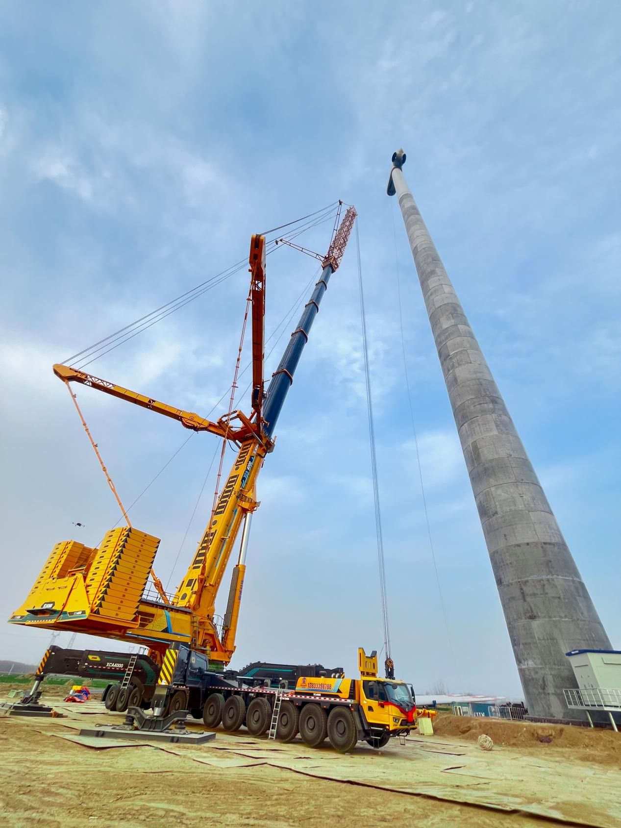 图为XCA4000将重达70吨的塔筒吊至130米高度