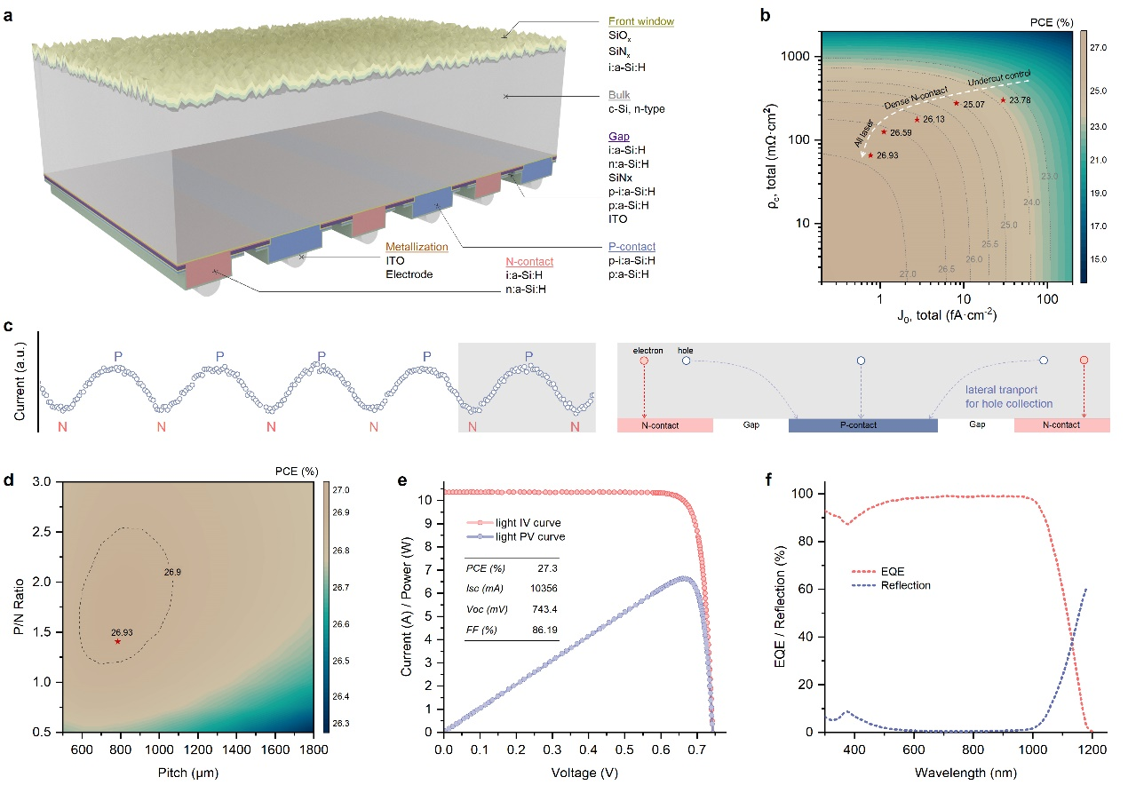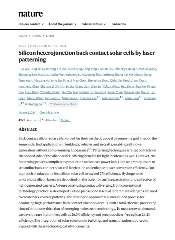 近日,隆基绿能科技股份有限公司(以下简称“隆基”)作为第一单位在《Nature》期刊在线发表了一篇题为《Siliconheterojunctionbackcontactsolarcellsbylaserpatterning》的研究论文,首次报道了通过全激光图形化工艺使晶硅电池光电转换效率突破27%的研究成果。这一突破标志着晶硅太阳能电池效率首次超过27%,为基于晶硅材料的光伏技术和产业树立了新的里程碑。