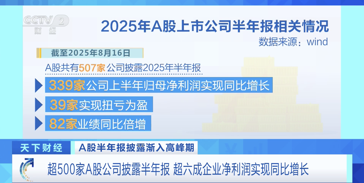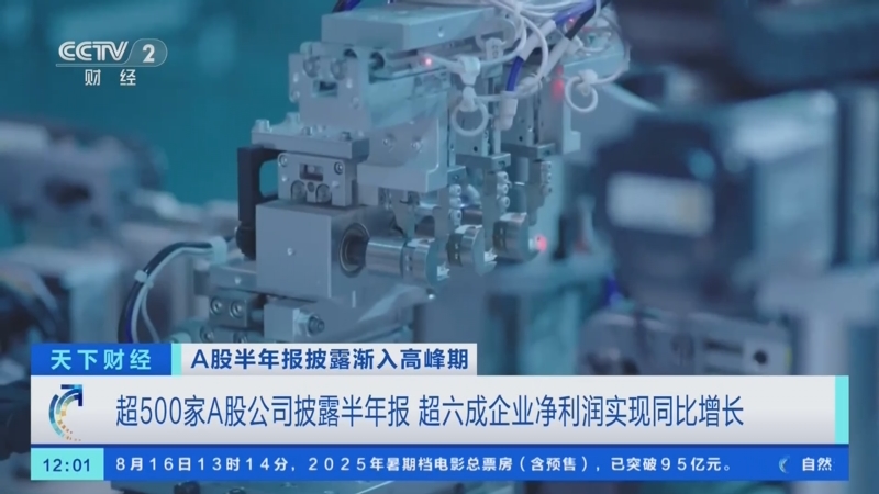 目前A股上市公司半年报披露渐入高峰期,截至16日,已有超500家A股上市公司披露2025年半年报,超六成企业净利润实现同比增长。