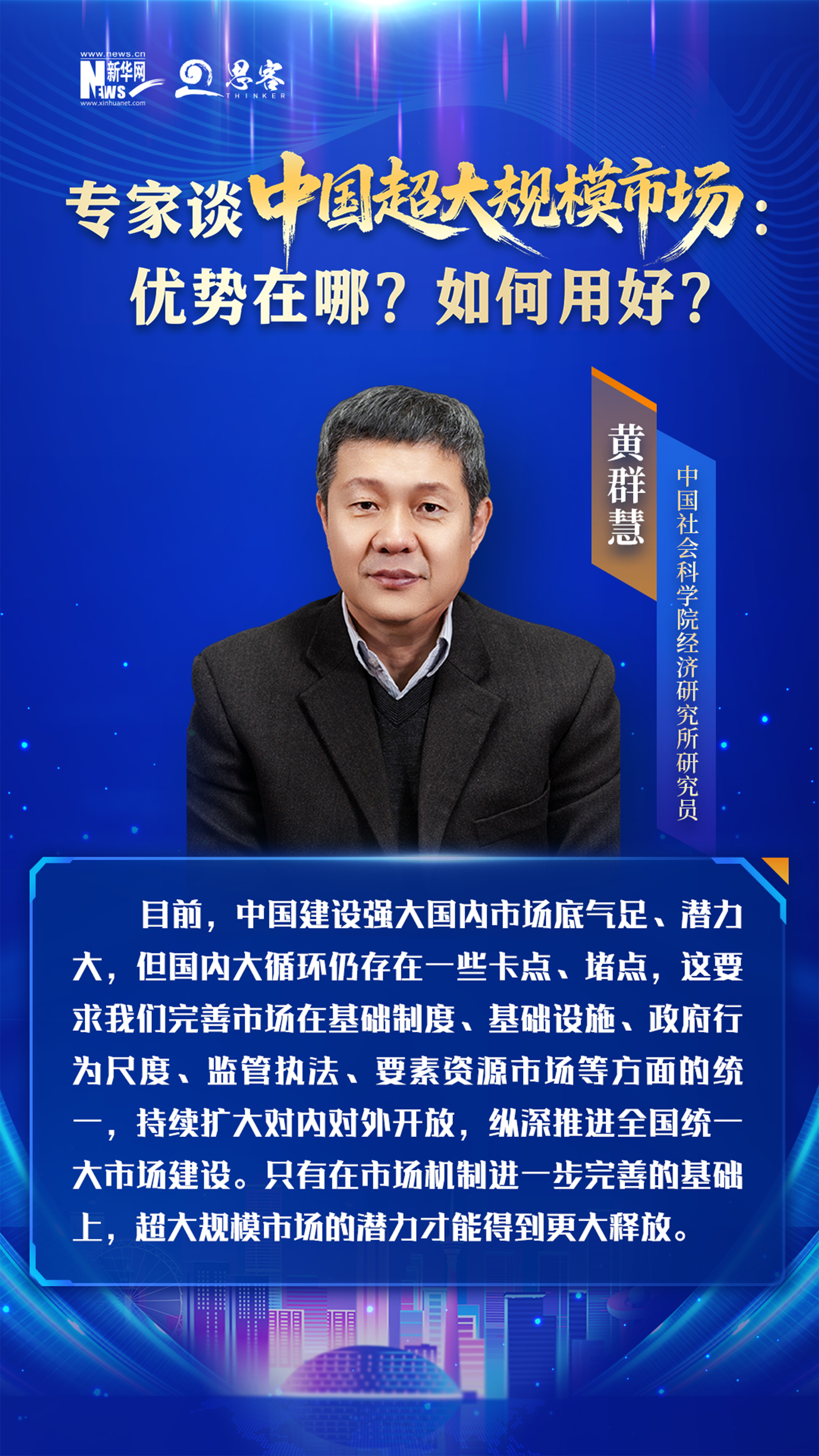 目前,中国建设强大国内市场底气足、潜力大,但国内大循环仍存在一些卡点、堵点,这要求我们完善市场在基础制度、基础设施、政府行为尺度、监管执法、要素资源市场等方面的统一,持续扩大对内对外开放,纵深推进全国统一大市场建设。只有在市场机制进一步完善的基础上,超大规模市场的潜力才能得到更大释放。