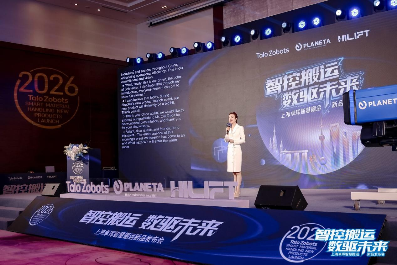 2026年1月23日,上海卓珲机器人以“智控搬运、数驱未来”为主题的新品发布会在苏州盛大启幕。本次盛会亮点纷呈:不仅重磅推出三款创新性核心产品——德国普兰尼特PXR系列智能钢丝绳电动葫芦(中国独家代理)、新加坡HILIFT SCU智能控制器(中国独家代理)及自主研发的Talo Zobots卓升桁架机器人,更官宣与德国普兰尼特、新加坡HILIFT、法国施耐德电气、意大利G.G.T集团四大全球头部企业达成深度战略合作。三款产品协同构建“智能核心+智能起重+智能搬运”的全场景解决方案,实现物料搬运从“机械执行”到“智能决策”的跨越性突破;而四大巨头的加持,为国内智慧搬运与智能生产的深度融合注入强劲动能,树立行业发展新标杆。