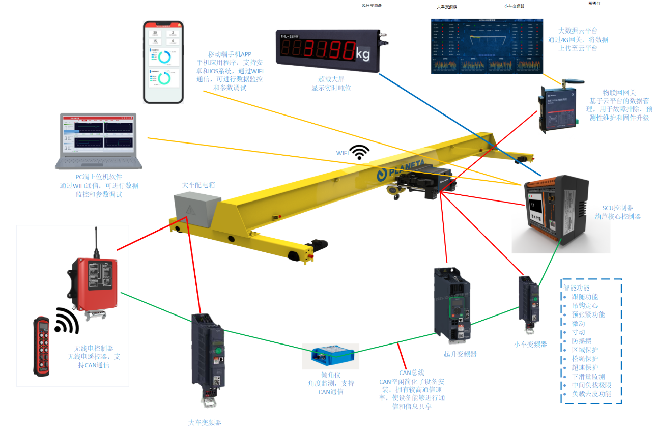 搭载SCU智能控制器的PXR系列智能钢丝绳电动葫芦,融合德国普兰尼特集团160余年起重技术积淀与现代智能控制技术,是重型物料搬运的智能核心装备。性能上,起重量1ton~100ton,工作级别达FEM/ISOM4M7,起升速度0~30m/min无级可调,毫米级精准对位,轻载时速度提升20%,大幅提效;模块化设计支持4种应用类型与多种绕绳方式,可无缝融入各类起重机,适配精密装配、重型吊装等多元场景;依托SCU远程智能运维能力,大幅降低设备调试时间,单台年省运维工时超50小时,全生命周期运营成本优化30%,实现高效作业与低成本运维双重价值。