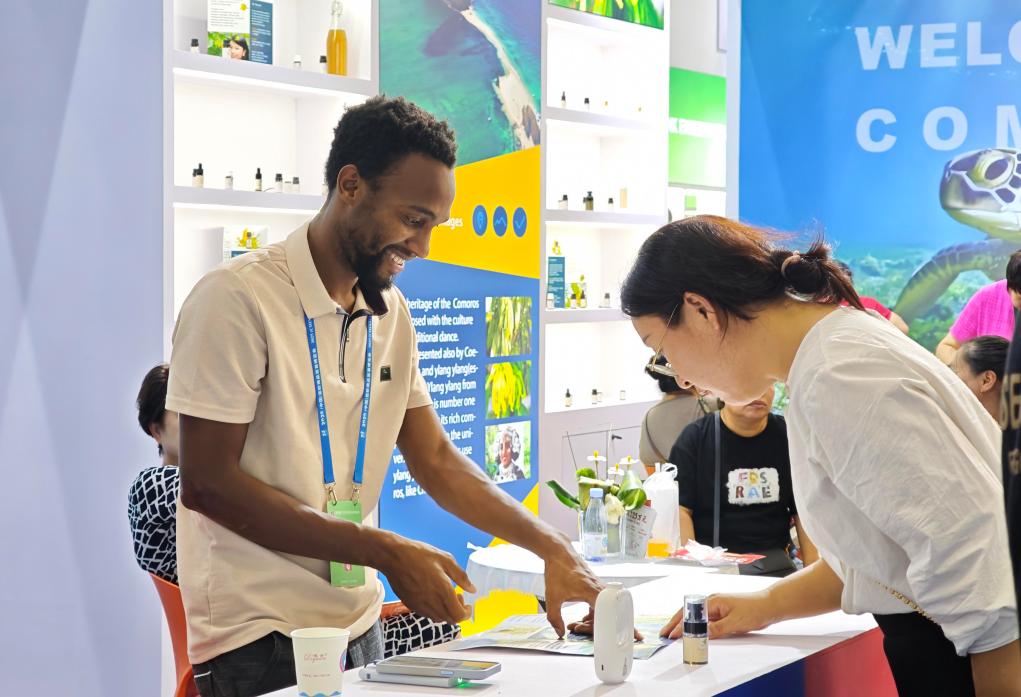 6月29日,在2025(中国)亚欧商品贸易博览会上,科摩罗展商丹尼尔向游客介绍产品