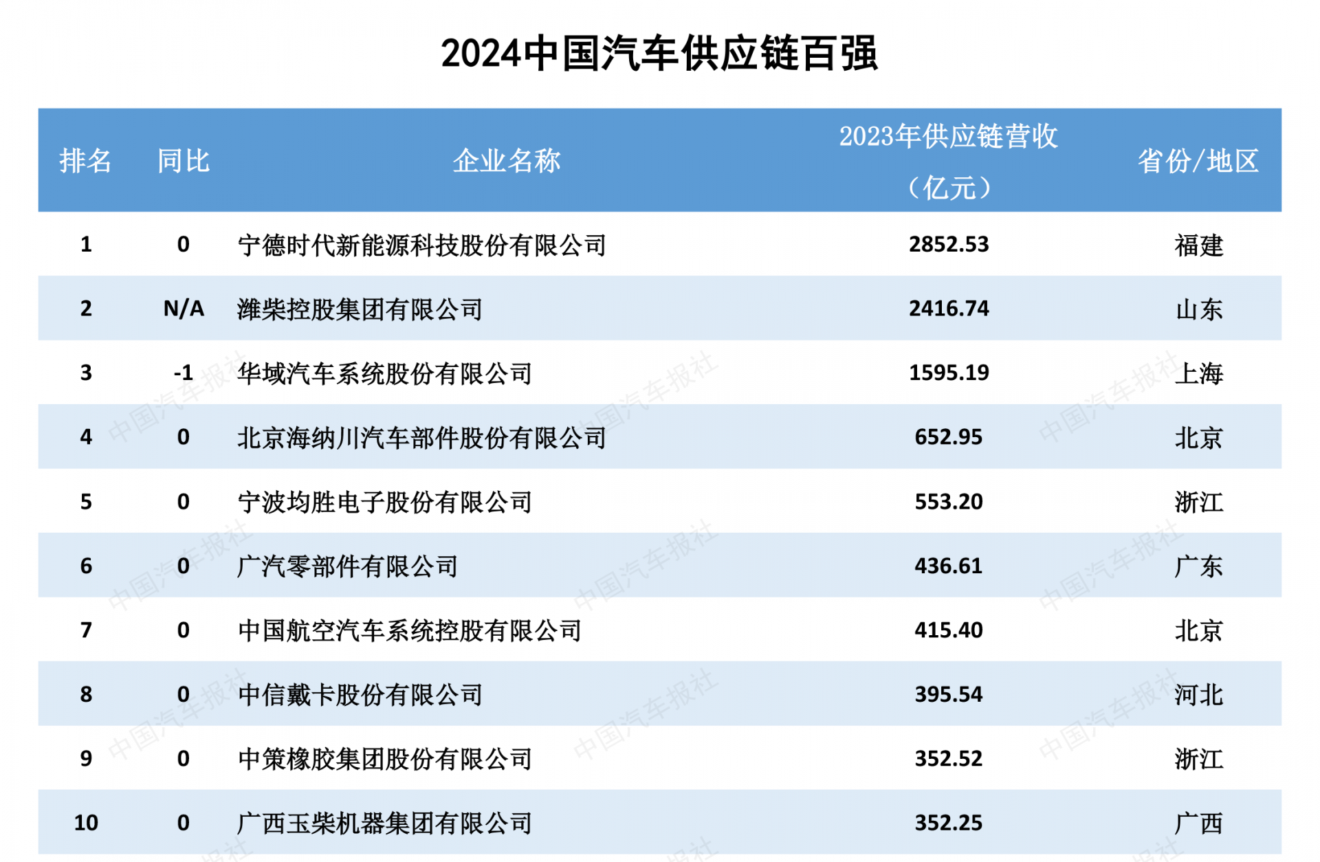 《白皮书》显示,2024“中国汽车供应链百强”排名前十位的企业分别是宁德时代、潍柴集团、华域汽车、海纳川、均胜电子、广汽部件、中航汽车系统、中信戴卡、中策橡胶和广西玉柴,覆盖了动力电池、传统动力、汽车电子、轮胎、轮毂以及综合性零部件企业。