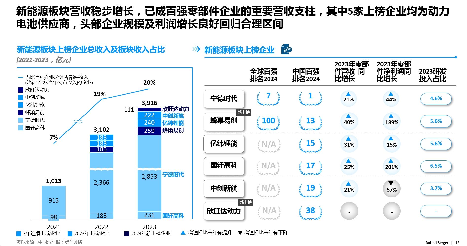 分业务板块而言,新能源板块的收入增速和盈利性最为突出,电子板块收入增速快,发动机及传统业务板块恢复势态良好。具体来看,新能源板块营收稳步增长,已成百强零部件企业的重要营收支柱,其中5家上榜企业均为动力电池供应商,分别是宁德时代、亿纬锂能、国轩高科、中创新航、欣旺达,头部企业规模及利润增长良好,回归合理区间。