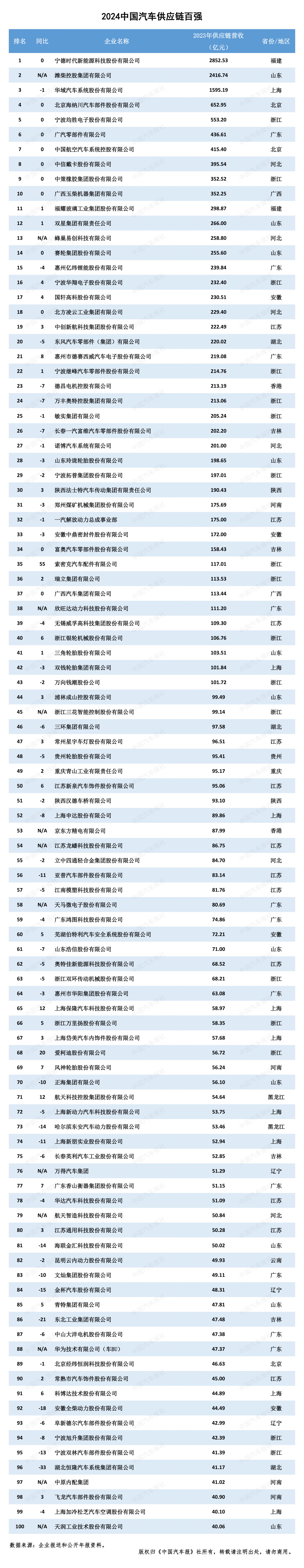 2024“全球汽车供应链百强”中,有三家中国企业进入前二十,分别是宁德时代、潍柴集团和华域汽车,这代表着中国零部件企业的深厚积累与创新能力,也向世界展示了中国企业在全球汽车供应链中不可或缺的角色和地位。