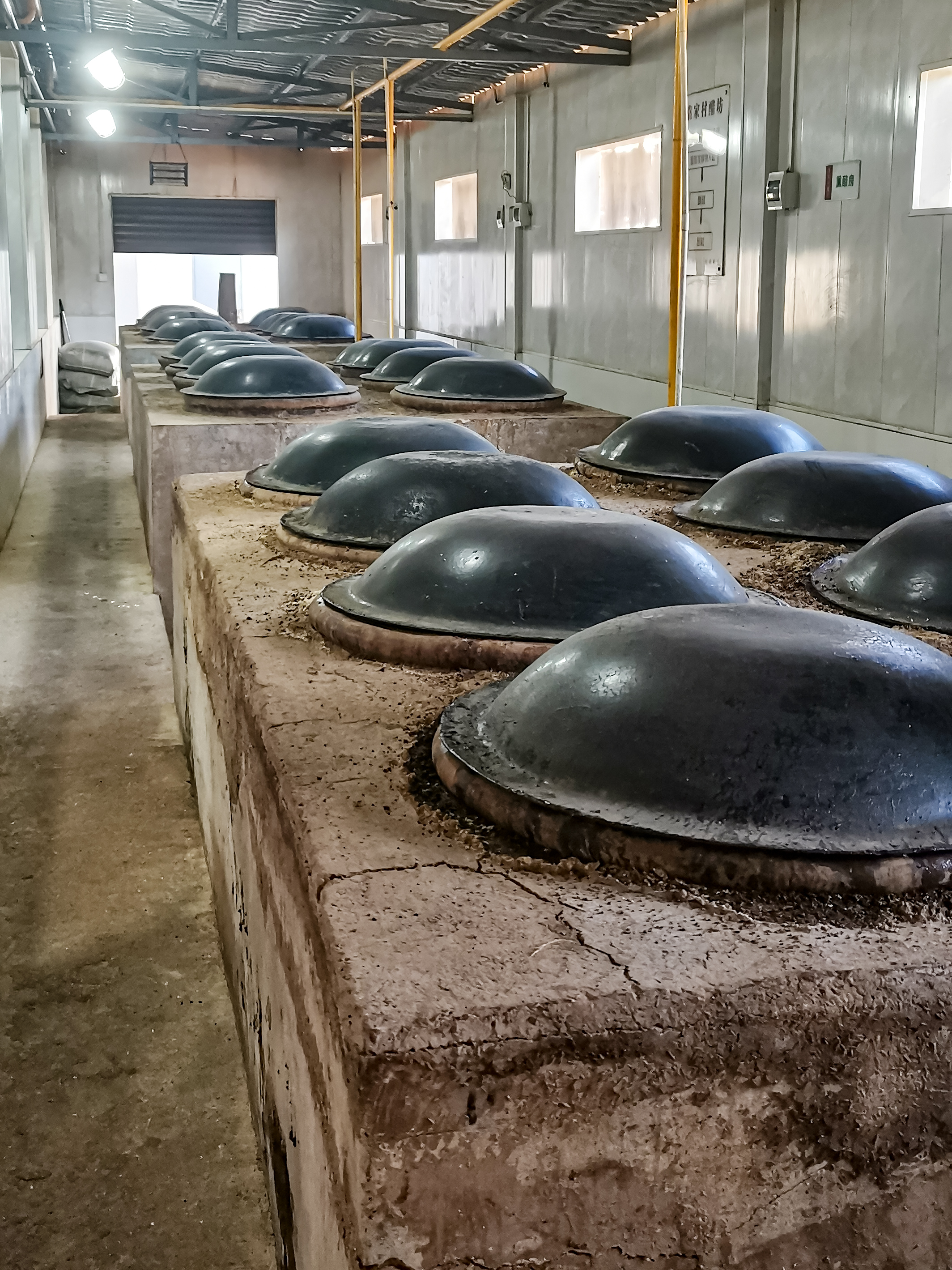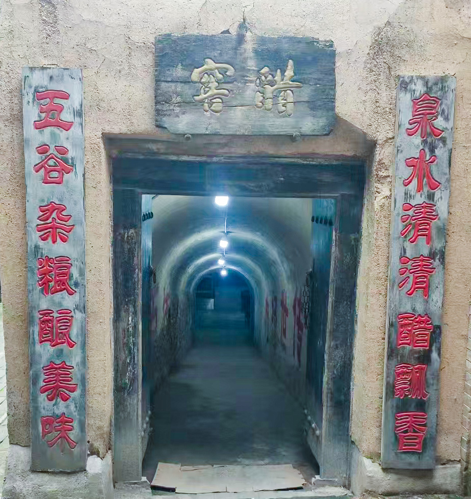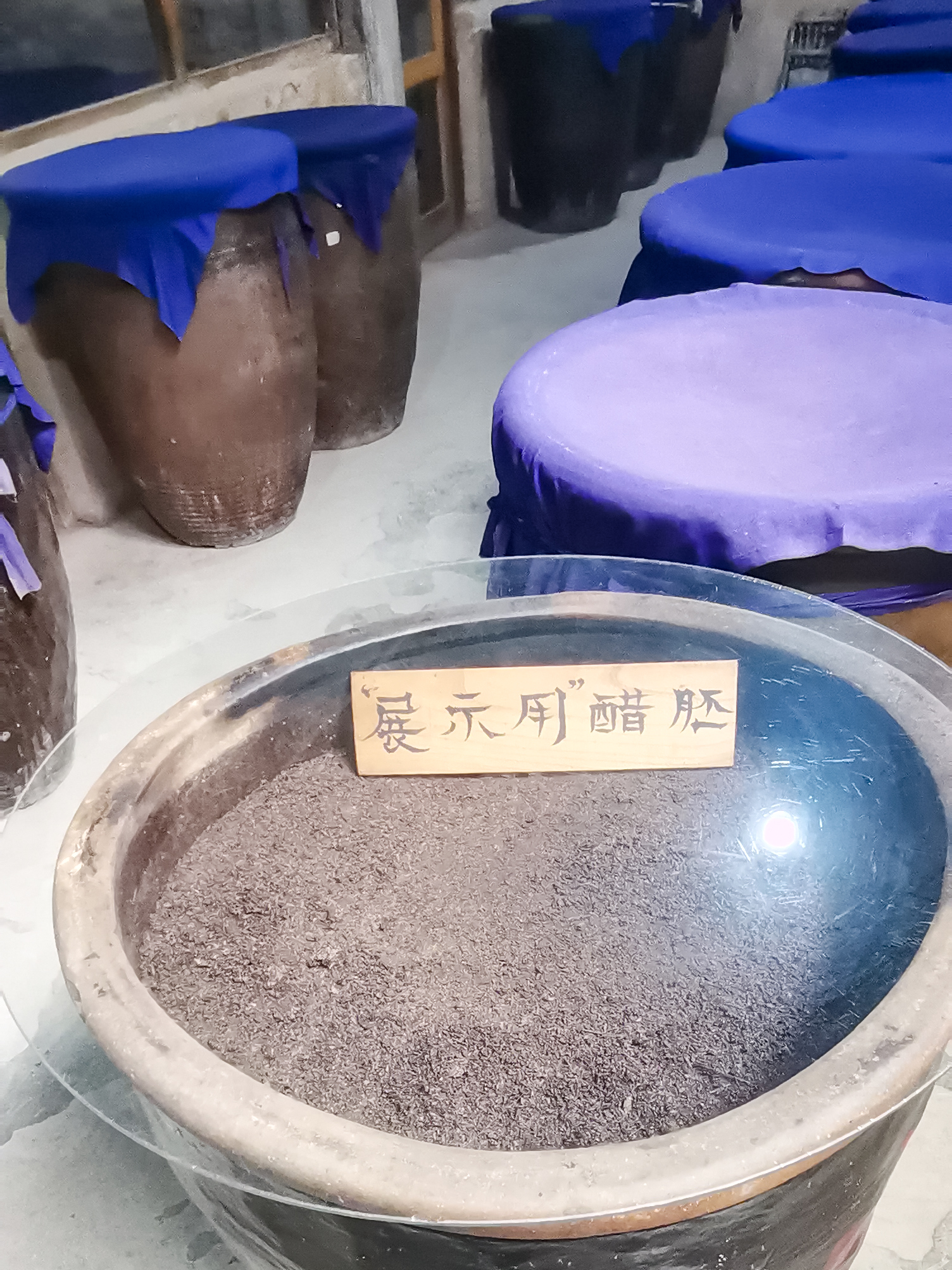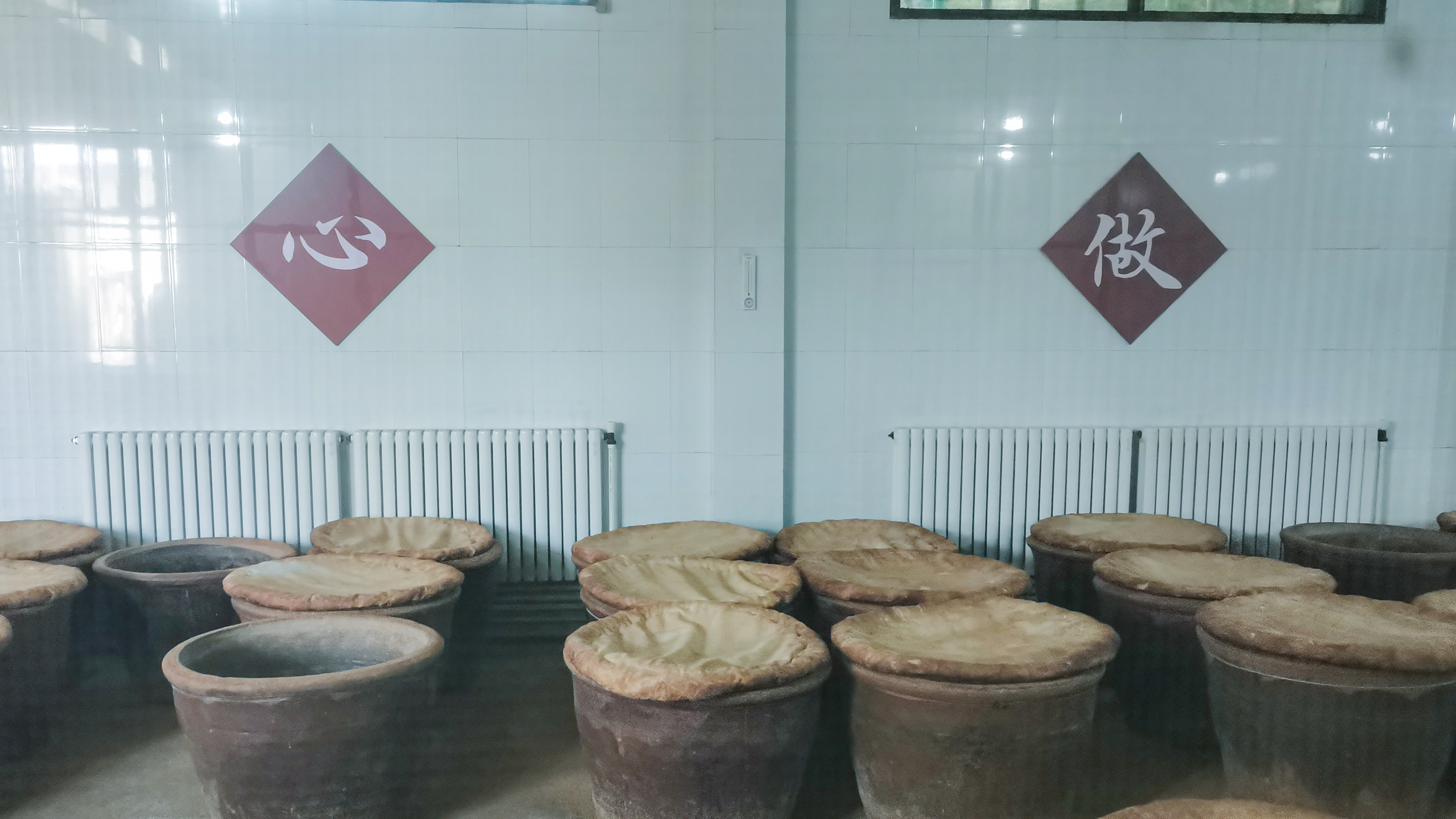 带着这样的疑问,记者穿过大堂,首先来到了院内储藏发酵用的醋窖。醋窖门上挂着的对联似乎给出了答案:上联“泉水清清醋飘香”,下联“五谷杂粮酿美味”。沿着低矮狭长的甬道一路向下,记者来到了醋窖的深处。这里的气温比外面略高,令人感到一丝暖意。醋窖内部分为多个窖室和一片公共空间。窖室从左至右依次存放着六个月、一年和三年的醋胚。公共空间内则整齐排列着大缸,其中一个缸上覆盖着玻璃,透过玻璃可以清晰地看到内部正在发酵的醋胚。棕黑色的醋胚被挤压得结结实实,缸内还摆放着一块标有“展示用醋胚”的木牌,其余的缸口则用灰蓝色的布严密封住,似乎在静静守护着这份独特的美味。