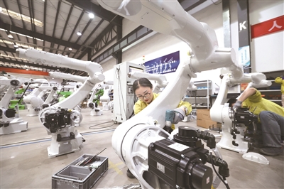 4月25日,安徽芜湖市鸠江区中国(安徽)自由贸易试验区芜湖片区埃夫特智能机器人生产车间一派繁忙,工人在进行工业机器人组装作业,赶制订单供市场。(王玉实摄)