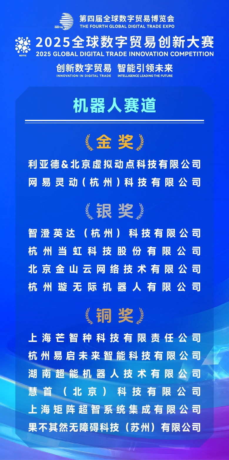 2025全球数字贸易创新大赛是第四届全球数字贸易博览会的重要活动之一,由杭州市商务局、杭州市萧山区人民政府、杭州临空经济示范区管委会共同主办。大赛以“创新数字贸易,智能引领未来”为主题,共设置机器人、人工智能、新电商、数字文娱四大赛道,吸引到了600余家来自机器学习、人形机器人、AI终端、算力芯片、智慧医疗、供应链金融、跨境电商、大宗商品、智能物流仓储、虚拟现实、数字文娱、元宇宙等领域的企业和团队报名参加。经过初赛阶段的层层筛选,共有110家优秀企业和团队进入决赛。四个赛道将分别决出金奖两名、银奖四名、铜奖六名。大赛旨在充分挖掘技术领先、具有较高商业价值和潜力的优质企业和团队,助力数字贸易创新发展。