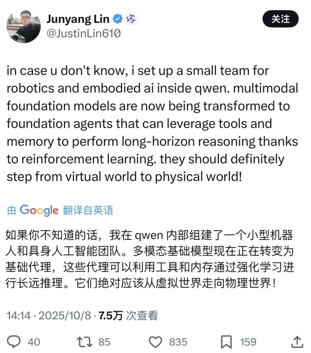 10月8日,通义千问大模型负责人林俊旸在社交媒体称,团队已内部成立“机器人与具身智能团队”。阿里正式进军机器人与具身智能领域。