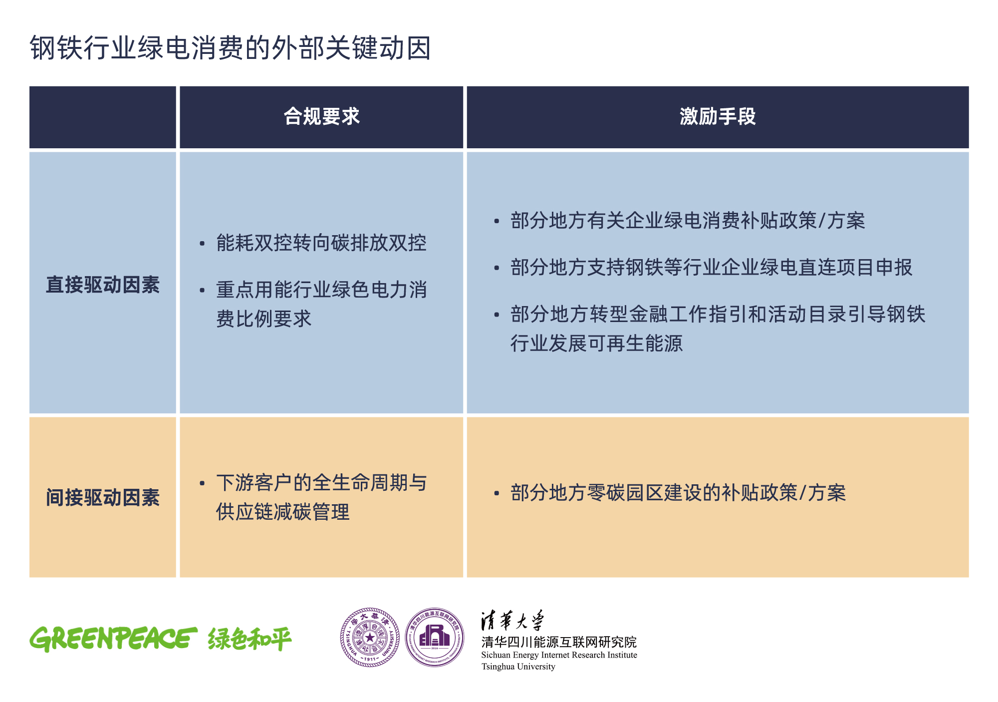 《中国钢铁行业绿电消费的进程、挑战与建议》报告从直接与间接驱动因素,合规要求与激励手段多维度分析了当前钢铁行业开展绿电消费的外部关键动因。