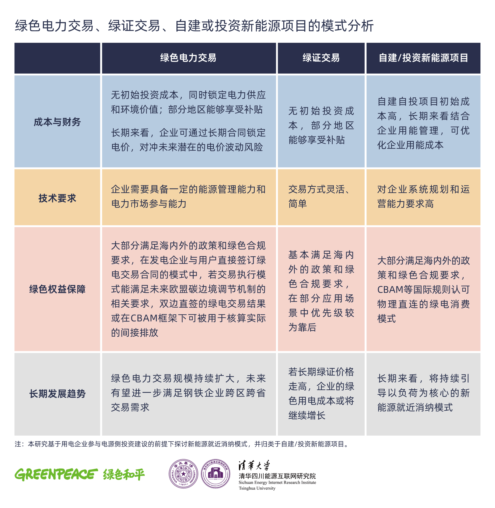 当前,中国钢铁企业绿电消费模式主要分为绿色电力交易、绿证交易、自建/投资新能源项目三类。报告梳理了中国钢铁企业的部分绿电消费案例,从成本与财务、技术要求、绿色权益保障、长期发展趋势等关键维度,对比分析了三种主要绿电消费形式的优势与要点。