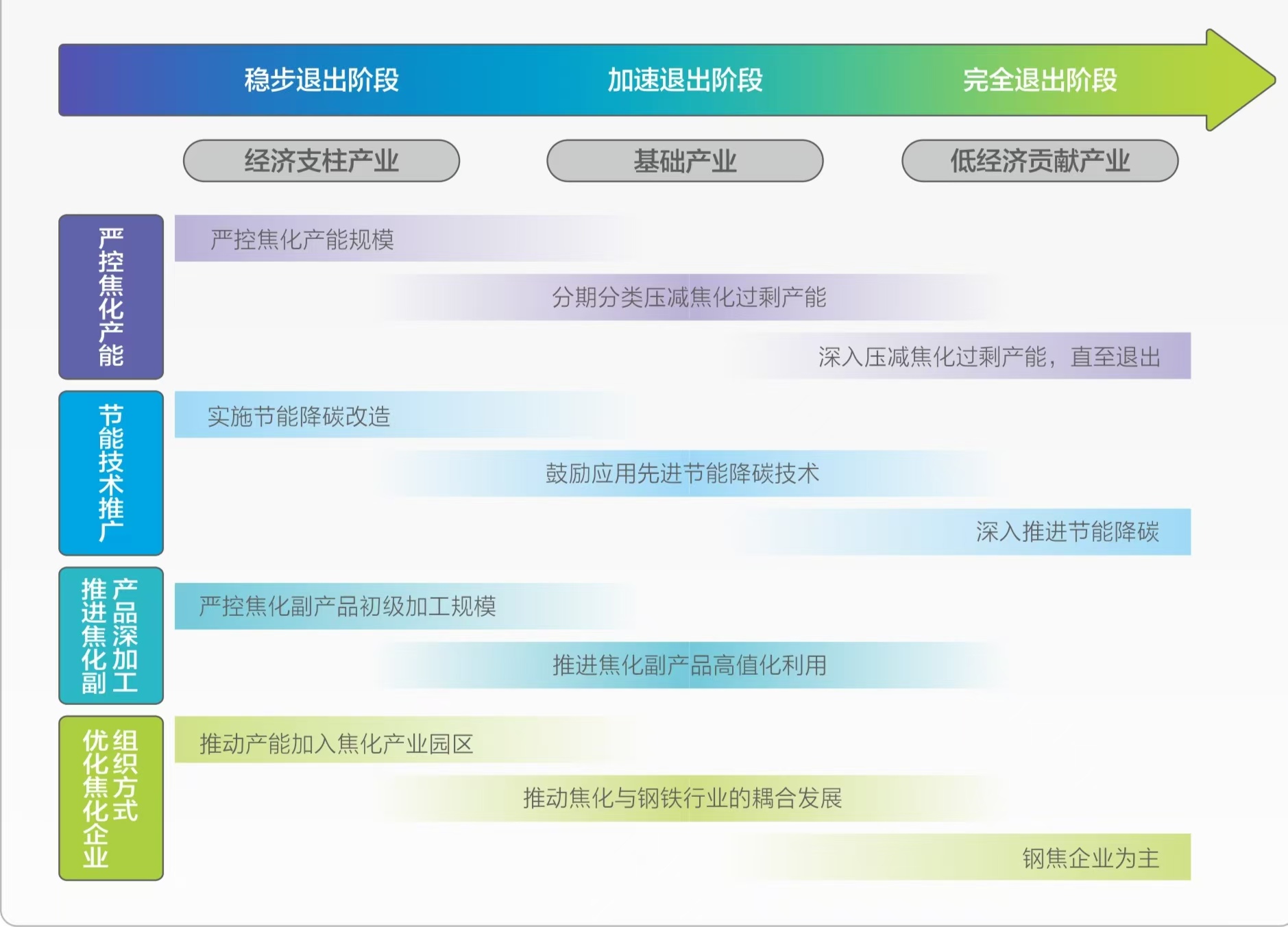 《资源型地区焦化行业提前平稳退出可行性研究——以山西为例》报告明确提出,焦化行业提前平稳退出至关重要。这种“提前”是相对于被动等待政策倒逼、技术替代冲击而言,抢占转型主动权;而“平稳”则是保障转型成功的关键,既要避免无序退出引发产能骤减、供应链断裂,也要防范就业流失、区域经济波动等社会风险。