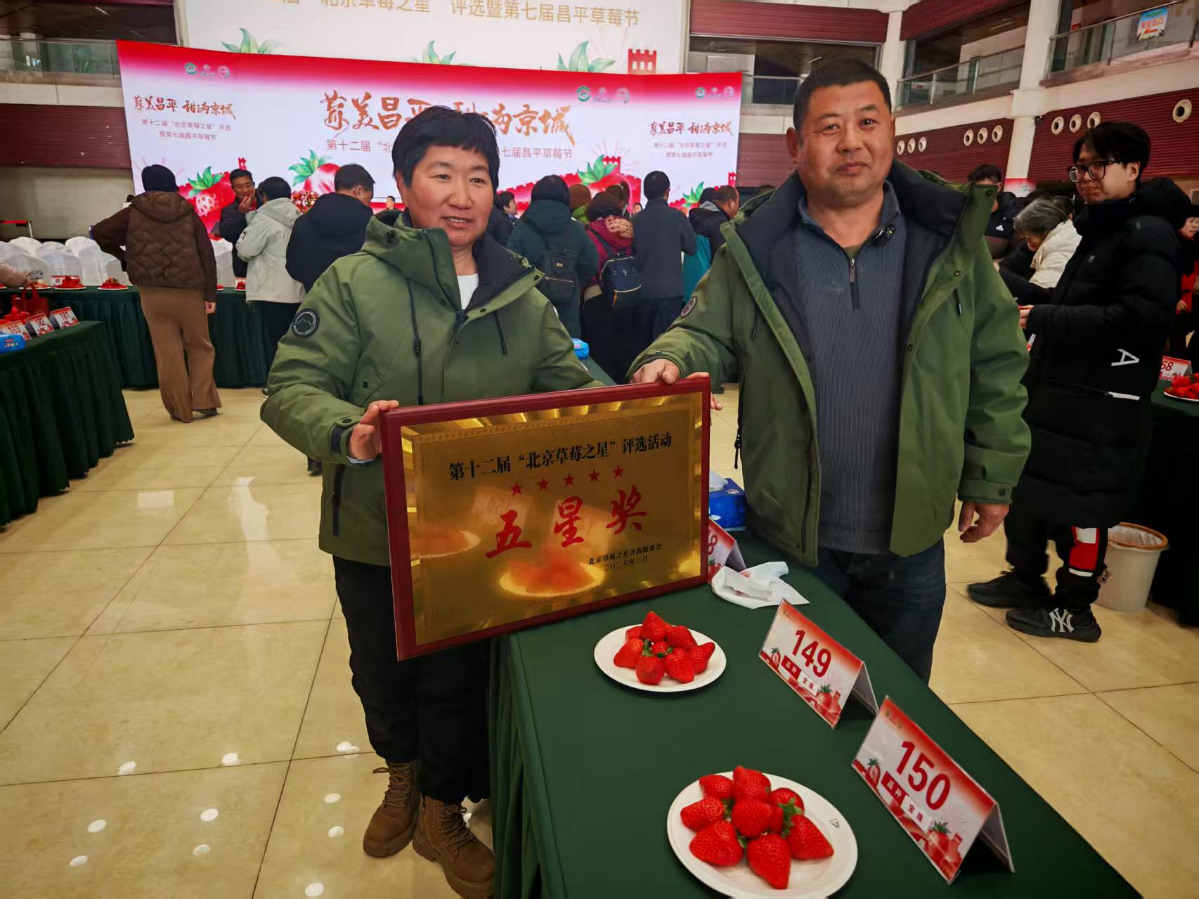 “本次五星奖获得者:宝珠草莓。”当大会主持人宣读结果之后,作为获胜者,北京兴寿乡都种植园魏建忠笑得合不拢嘴。在自家种植的宝珠草莓展台旁,魏建忠两口子携手捧着奖牌拍了一张合影。