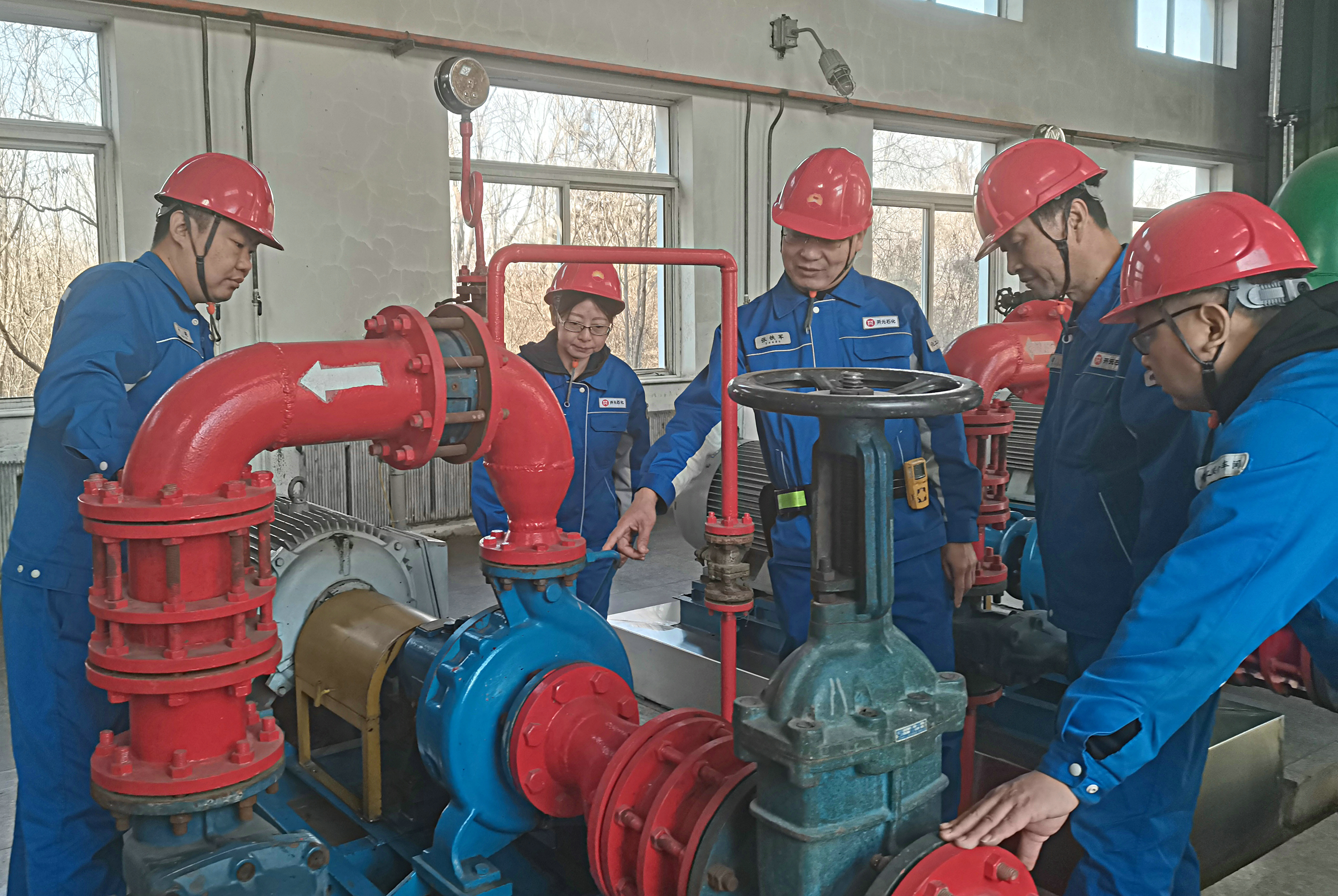 生产五班班长张铁军(中)给外操讲解消防泵的使用和注意事项,提高应急处置能力