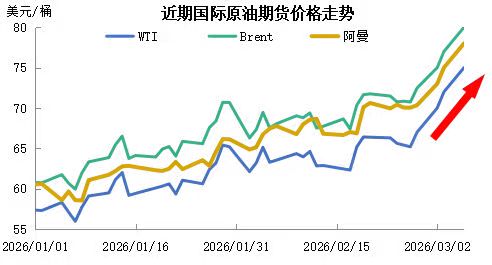 “若此次战事在短时间的激烈交战后停火,且双方重回谈判桌,那么原油价格将呈现冲高回落的态势,从2026年3月开始,月度WTI和布伦特的运行区间比以前有所扩大,分别处于60-70和65-75美元/桶之间较为合理。”韩政己分析。