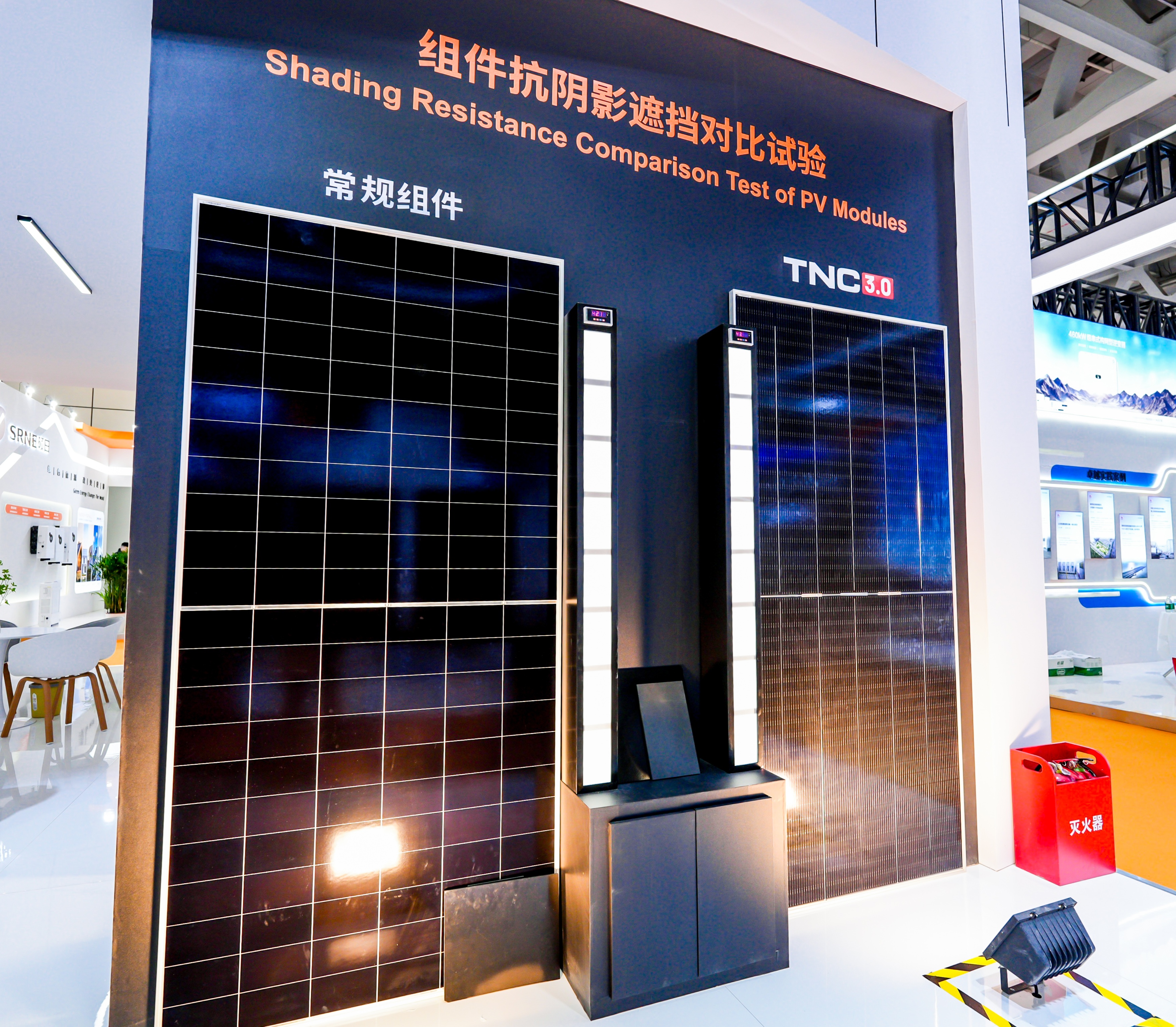 展会现场,不少与会者驻留在通威展台,观看TNC3.0四分片组件抗阴影遮挡对比实验以及组件在弱光环境下的漏电流对比模型。通威产品营销经理王奕璜向中国工业报记者表示,模拟真实应用场景,进一步印证了TNC3.0高功率组件的多场景发电能力。