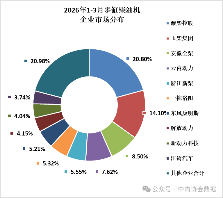 3月,多缸柴油机企业共计销量49.39万台,环比增长55.61%,同比增长11.31%;1-3月累计销量123.72万台,同比增长10.02%。潍柴、玉柴、全柴、云内、新柴、一拖、东康、解放动力、新动力科技、江铃销量居前十名,占多缸柴油机总销量的79.02%;市场份额占比中:潍柴20.80%、玉柴14.10%、全柴8.50%、云内7.62%、新柴5.55%、一拖5.32%、东康5.21%、解放动力4.15%、新动力科技4.04%、江铃3.74%。
