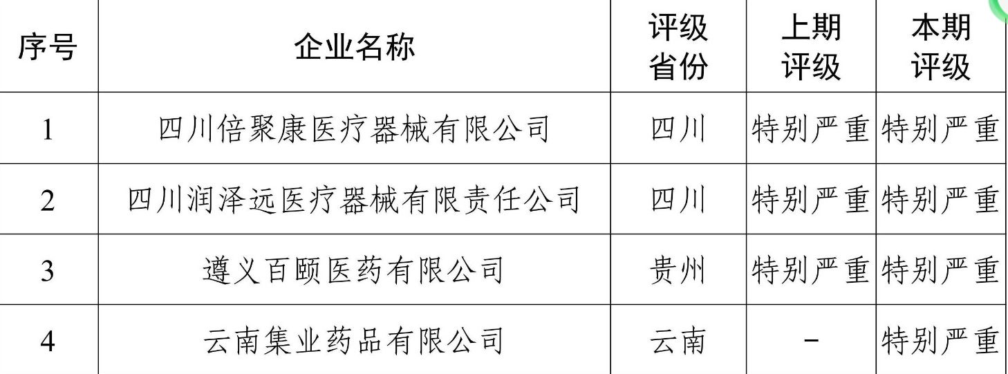 4家评级为“特别严重”的医药企业分别为四川倍聚康医疗器械有限公司、四川润泽远医疗器械有限责任公司、遵义百颐医药有限公司、云南集业药品有限公司