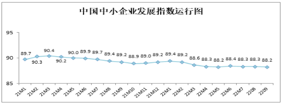 10月10日,中国中小企业协会发布9月中国中小企业发展指数报告,报告显示,9月份,宏观经济环境继续保持趋稳向好,但由于美联储连续加息,全球滞胀风险上升,外部环境不稳定不确定因素增加;国内疫情持续反复、经济增长“三重压力”仍然存在,内生动力偏弱,中小企业复苏的基础仍不稳固。9月份,中国中小企业发展指数(SMEDI)为88.2,基本保持平稳,比上月略降0.1点,低于2021年同期水平。