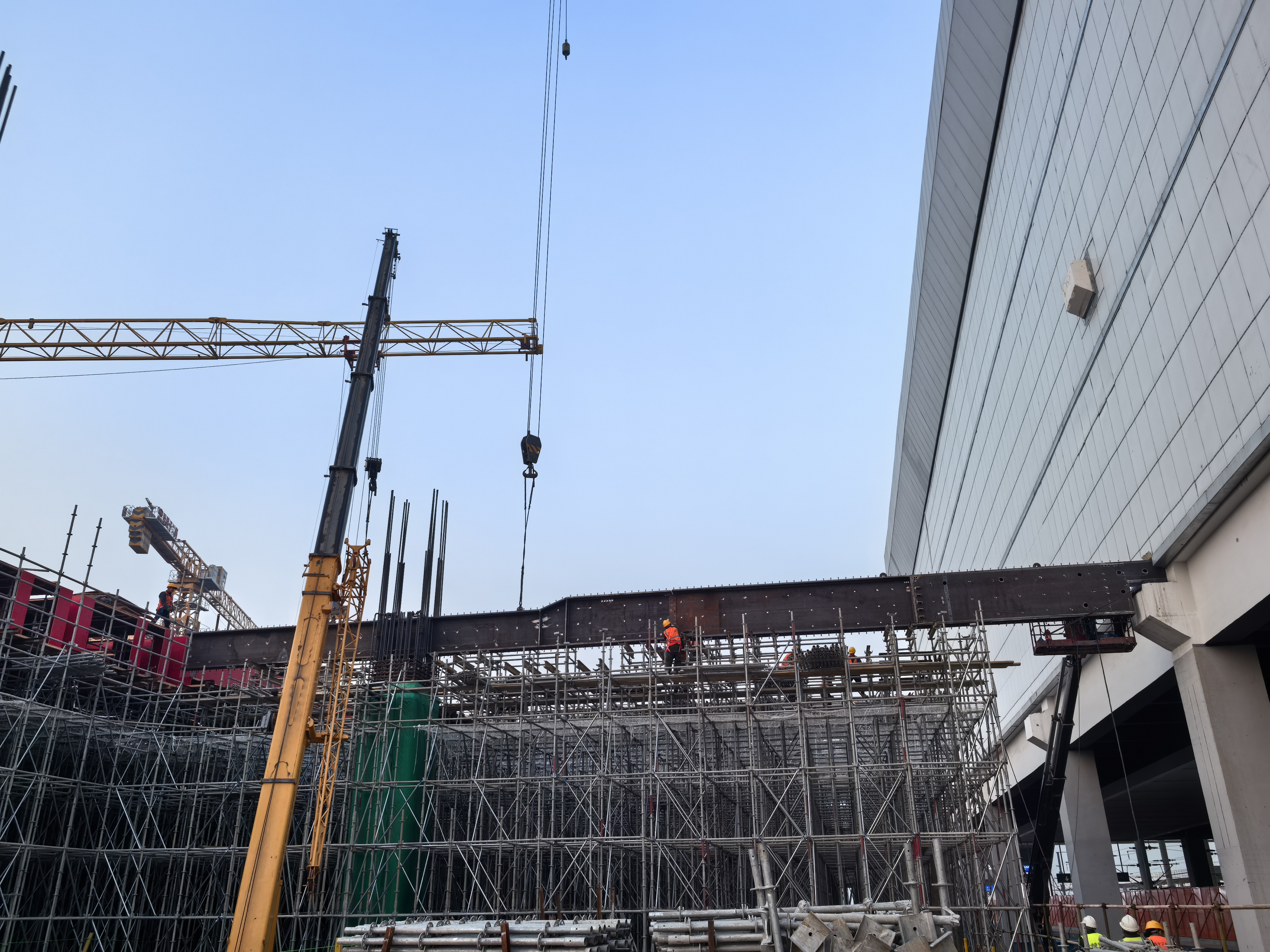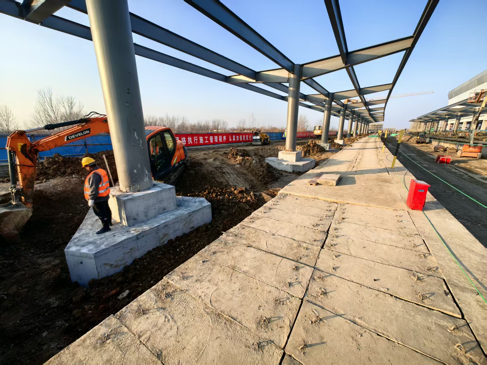 在阜阳西站西侧施工场地,记者看到扩建站房正开展主体结构施工,钢筋工、砼工、水电工在各自岗位上有序忙碌。施工区域与营业线之间用隔离网明确分隔,邻近营业线一侧,钢结构雨棚的架设工作正稳步推进。中铁十二局该项目负责人薛勇升介绍,春节前将完成站房主体夹层施工,节后全力冲刺主体结构,预计3月初实现主体结构封顶。