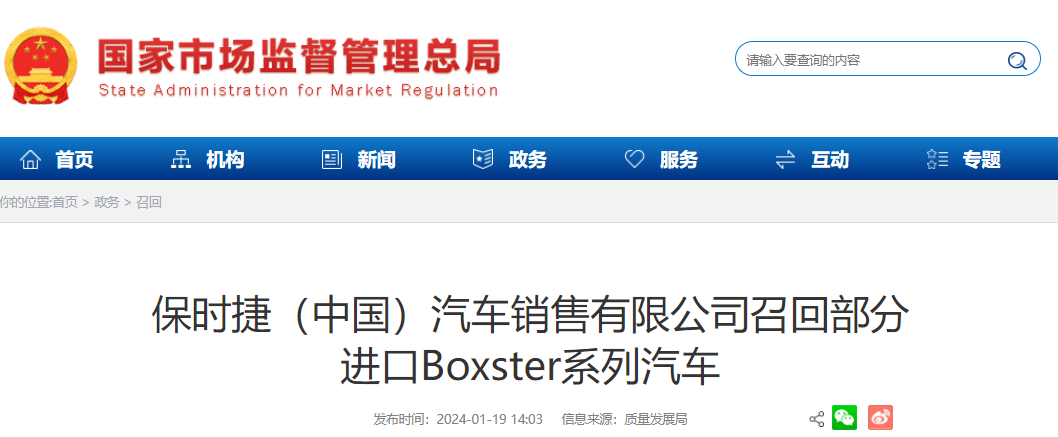 保时捷(中国)汽车销售有限公司召回进口Boxster系列汽车12辆