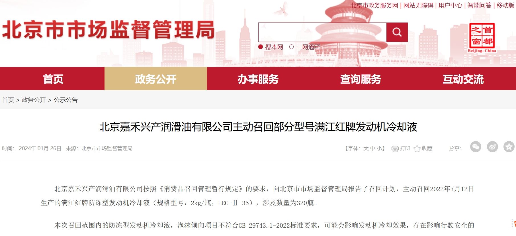 可能影响发动机冷却效果!320瓶满江红牌防冻型发动机冷却液被召回