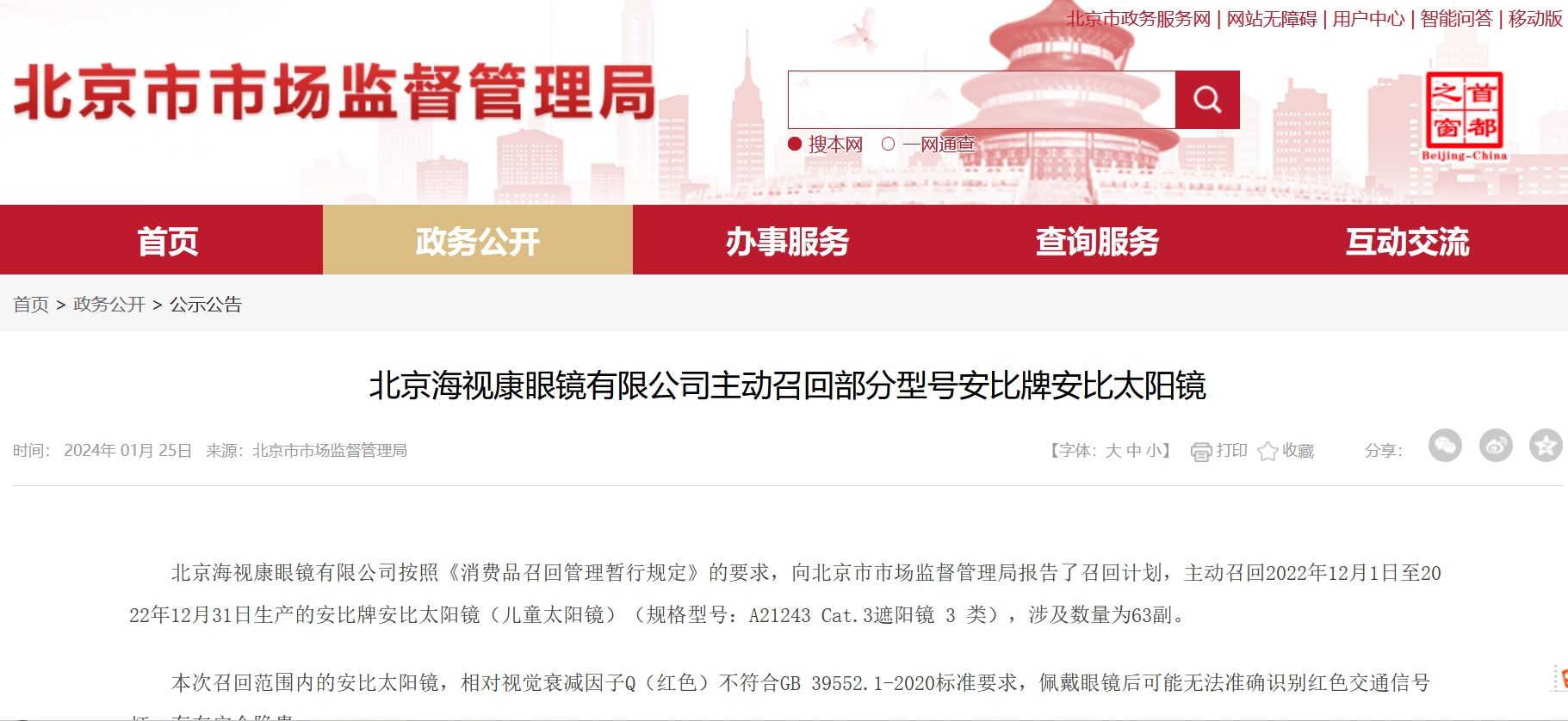 近日,北京海视康眼镜有限公司向北京市市场监管局报告召回计划,召回2022年12月1日至2022年12月31日生产的安比牌安比太阳镜(儿童太阳镜)(规格型号:A21243 Cat.3遮阳镜 3 类),涉及数量为63副。召回范围内的安比太阳镜,相对视觉衰减因子Q(红色)不符合GB 39552.1-2020标准要求,佩戴眼镜后可能无法准确识别红色交通信号灯,存在安全隐患。(北京市市场监管局)