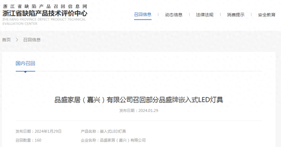 品盛家居(嘉兴)有限公司召回品盛牌嵌入式LED灯具160只
