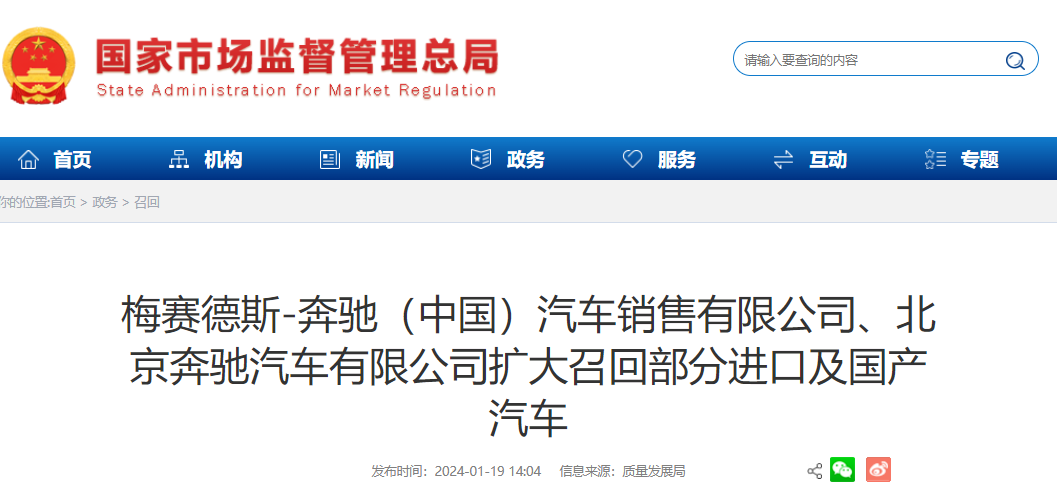 日前,梅赛德斯-奔驰(中国)汽车销售有限公司、北京奔驰汽车有限公司根据《缺陷汽车产品召回管理条例》和《缺陷汽车产品召回管理条例实施办法》的要求,向国家市场监督管理总局备案了召回计划。自2024年2月19日起,召回生产日期在2013年6月6日至2018年6月12日期间的部分进口A级、C级、CLA、GLE SUV、S级汽车,共计14辆;生产日期在2015年1月14日至2020年8月26日期间的部分国产C级、GLA、GLC SUV汽车,共计36辆。本次召回属于2021年12月8日发布的《梅赛德斯-奔驰(中国)汽车销售有限公司、北京奔驰汽车有限公司召回部分进口和国产奔驰汽车》召回活动的扩大召回。(国家市场监督管理总局)