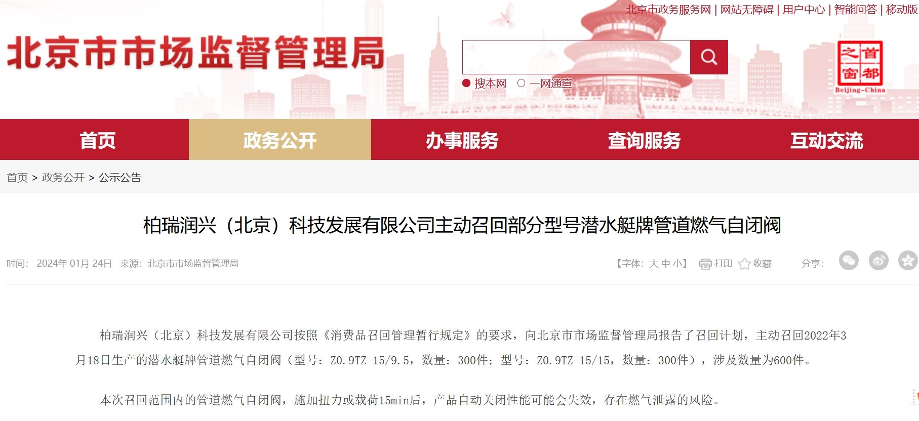 近日,柏瑞润兴(北京)科技发展有限公司向北京市市场监管局报告召回计划,召回2022年3月18日生产的潜水艇牌管道燃气自闭阀(型号:Z0.9TZ-15/9.5,数量:300件;型号:Z0.9TZ-15/15,数量:300件),涉及数量为600件。召回范围内的管道燃气自闭阀,施加扭力或载荷15min后,产品自动关闭性能可能会失效,存在燃气泄露的风险。(北京市市场监管局)
