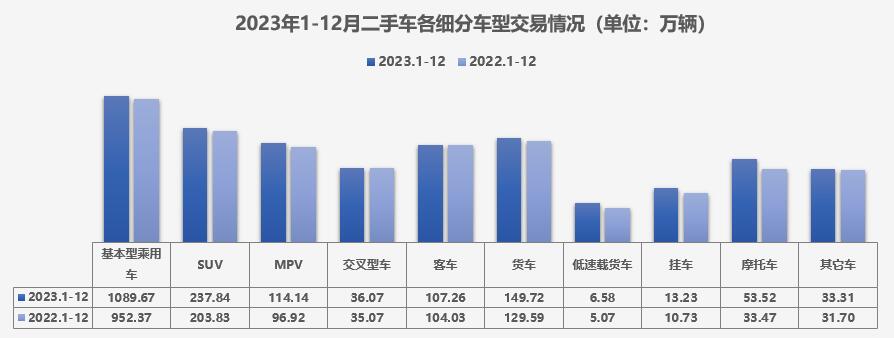 中国汽车流通协会统计数据显示,2023年二手车中的乘用车累计交易1089.67万辆,同比增长14.42%;SUV共交易237.84万辆,同比增长16.68%;MPV共交易114.14万辆,同比增长17.77%;交叉型乘用车共交易36.07万辆,同比增长2.85%。商用车中,载货车共交易149.72万辆,同比增长15.53%;客车107.26万辆,同比增长3.11%。