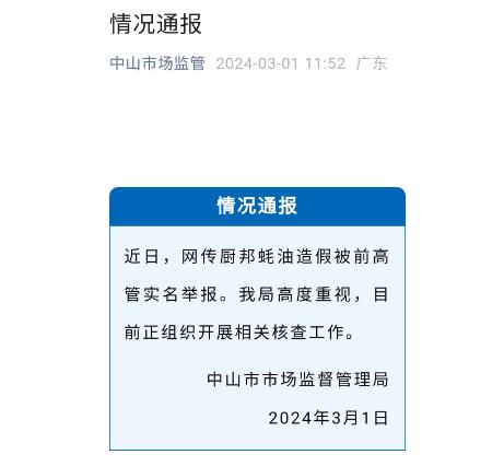 近日,厨邦前高管实名爆料厨邦蚝油造假一事迎来新进展。据广东中山市市场监督管理局微信公众号3月1日发布的消息,就网传厨邦蚝油造假被前高管实名举报一事,中山市市场监督管理局高度重视,正组织开展相关核查工作。