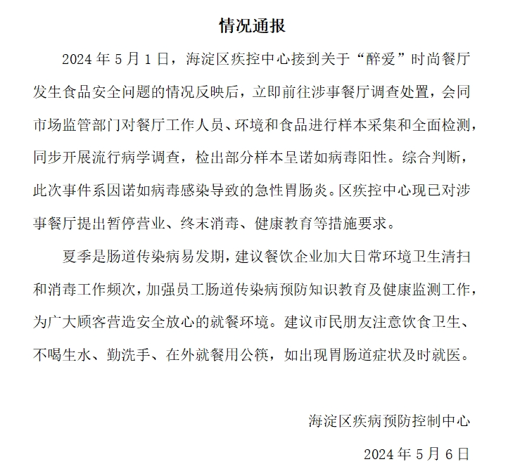 5月6日,据海淀区疾控中心通报,2024年5月1日,海淀区疾控中心接到关于“醉爱”时尚餐厅发生食品安全问题的情况反映后,立即前往涉事餐厅调查处置,会同市场监管部门对餐厅工作人员、环境和食品进行样本采集和全面检测同步开展流行病学调查,检出部分样本呈诺如病毒阳性。