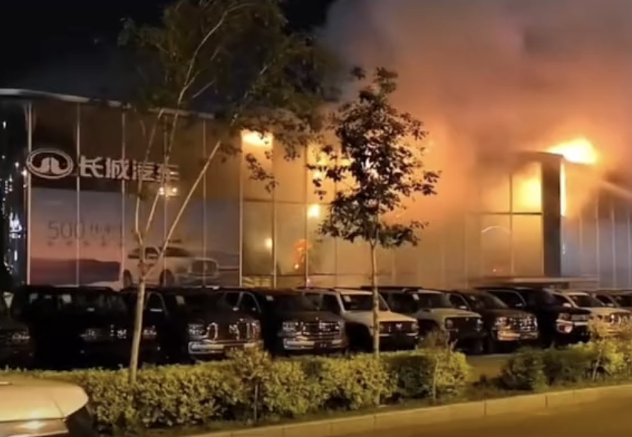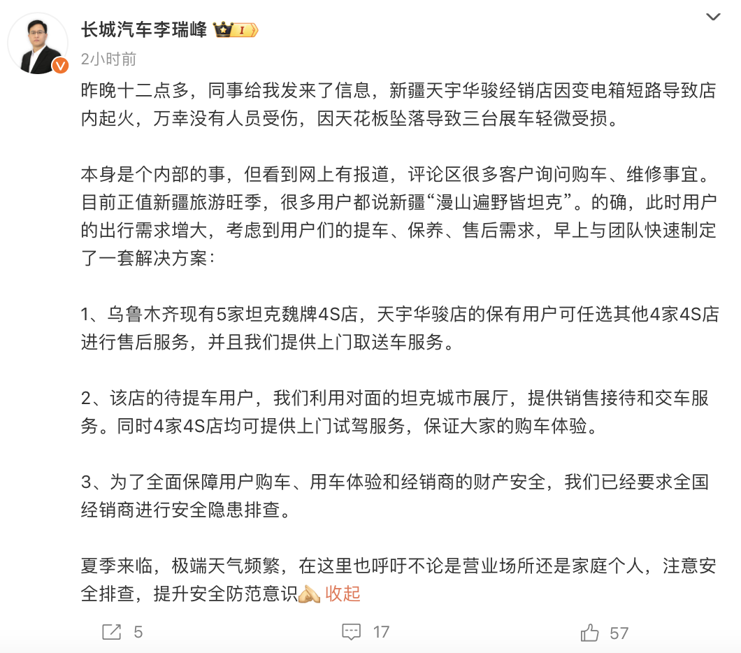 中国网汽车5月22日讯 日前一家新疆坦克4S店发生起火,有目击者称:“凌晨12点,路过看到的,开始就是二层的小火苗,然后越烧越大,玻璃炸了,就报警了……”。5月22日,长城汽车股份有限公司CGO李瑞峰在其社交平台上正式回应称:昨晚十二点多,新疆天宇华骏经销店因变电箱短路导致店内起火,万幸没有人员受伤,因天花板坠落导致三台展车轻微受损。