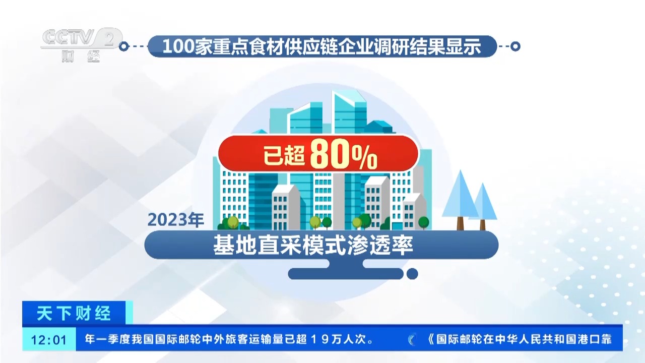 我国食材供应链企业链条逐渐向上游延伸。100家重点食材供应链企业调研结果显示,2023年基地直采模式渗透率已超80%,有效缩短供应链链条,降低食材采购和流通成本。