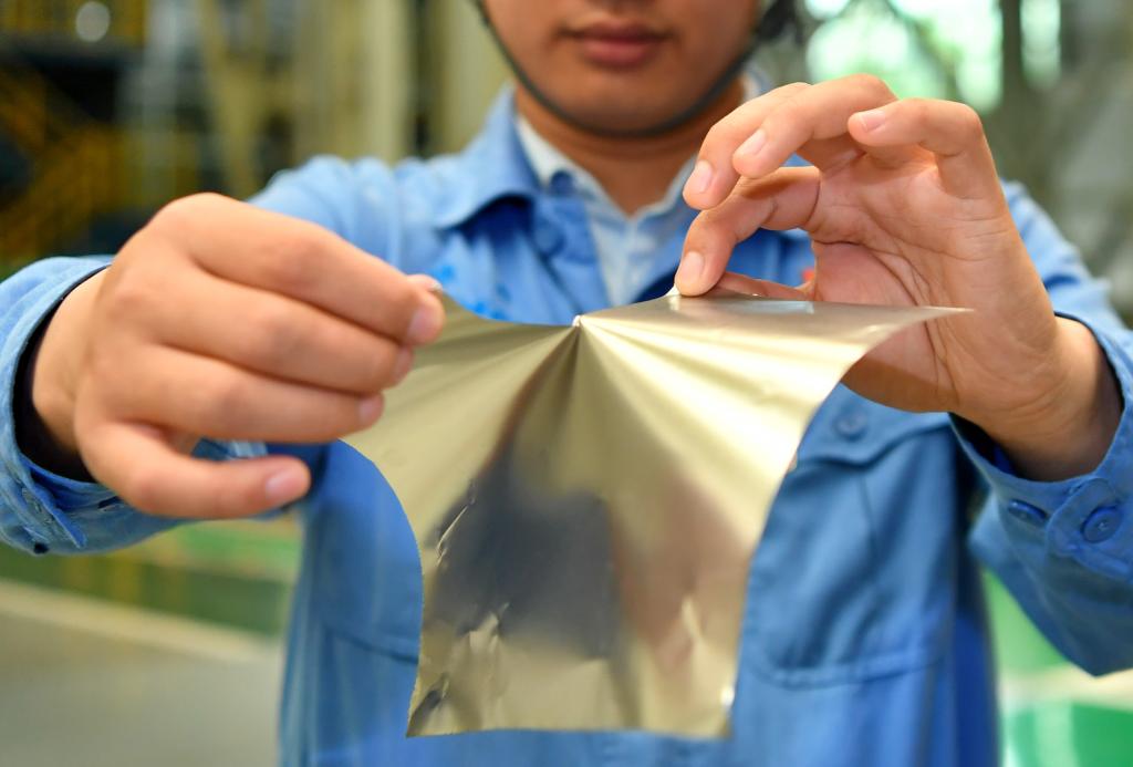在位于山西的太钢集团,员工展示用手撕开0.02毫米厚的超薄带状不锈钢(2019年5月24日摄)。新华社记者曹阳摄