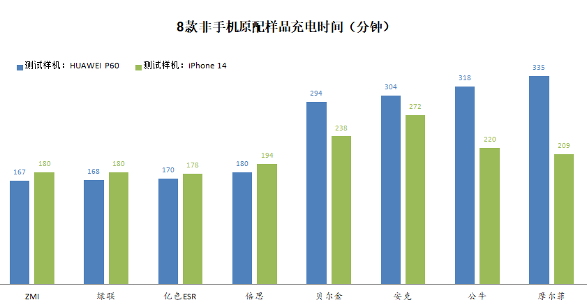针对8款非原配充电器,试验统一选择两款热销手机(HUAWEIP60和iPhone14)作为负载机,发现8款样品充电时间差异明显,平均用时约3到5小时,其中,对HUAWEIP60负载机的充电时间在2小时47分钟至5小时35分钟之间,对iPhone14负载机的充电时间在2小时58分钟至4小时32分钟之间。ZMI、绿联、亿色三款样品对两台负载机的充电时间均在3小时以内,表现较好。