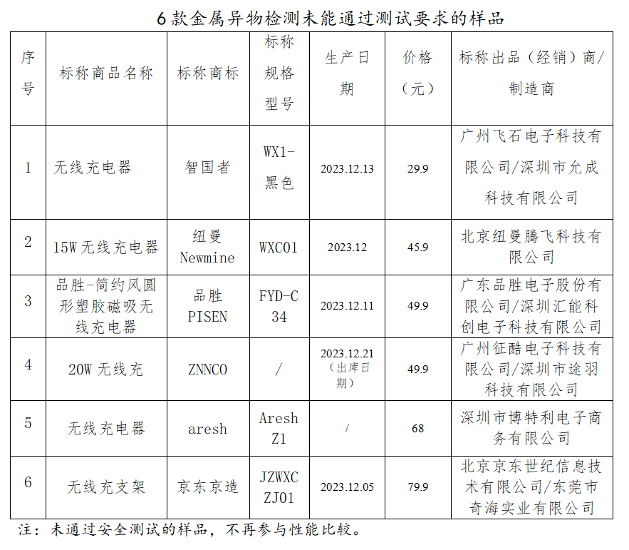 如标称出品(经销)商/制造商为广州飞石电子科技有限公司/深圳市允成科技有限公司的无线充电器,标称商标为智国者,标称规格型号为WX1-黑色,生产日期为2023.12.13;标称出品(经销)商/制造商为北京纽曼腾飞科技有限公司的15W无线充电器,标称商标为纽曼Newmine,标称规格型号为WXC01,生产日期为2023.12等6款样品未通过安全测试,不再参与性能比较。