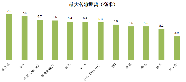 此外,不用拆卸手机壳、支持“带壳充电”是无线充电器的一大卖点。本次比较试验选择两款常见手机壳进行验证测试,同时再用A4纸模拟手机壳,测试可充电状态下手机与无线充电器之间放入A4纸的最大厚度,作为样品的最大传输距离。试验发现,12款样品均能“带壳充电”,最大传输距离在3.9毫米至7.6毫米之间,平均最大传输距离为6.0毫米,其中4款原配充电器的最大传输距离均在6.0毫米以上。