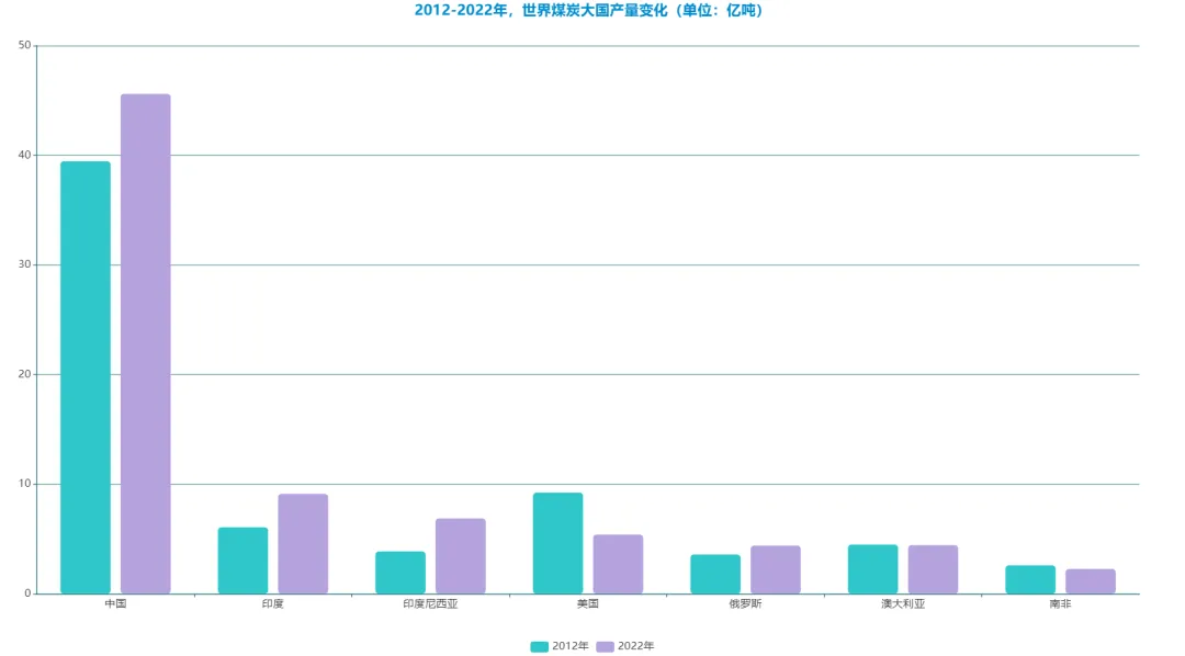 在2012-2022年期间,世界前10大煤炭生产国煤炭生产变化情况如下: