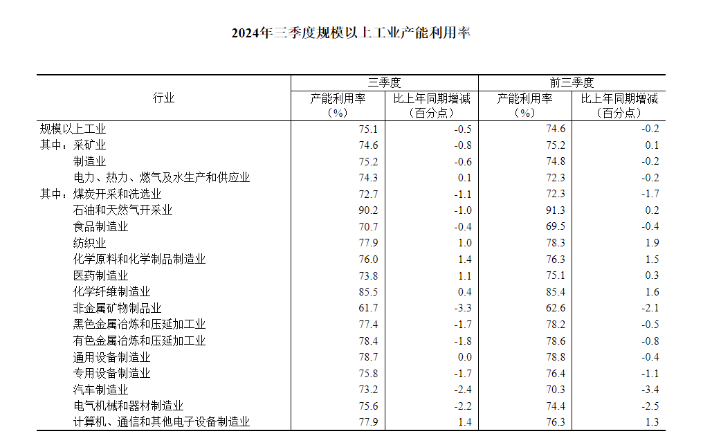分主要行业看,2024年三季度,煤炭开采和洗选业产能利用率为72.7%,食品制造业为70.7%,纺织业为77.9%,化学原料和化学制品制造业为76.0%,非金属矿物制品业为61.7%,黑色金属冶炼和压延加工业为77.4%,有色金属冶炼和压延加工业为78.4%,通用设备制造业为78.7%,专用设备制造业为75.8%,汽车制造业为73.2%,电气机械和器材制造业为75.6%,计算机、通信和其他电子设备制造业为77.9%。