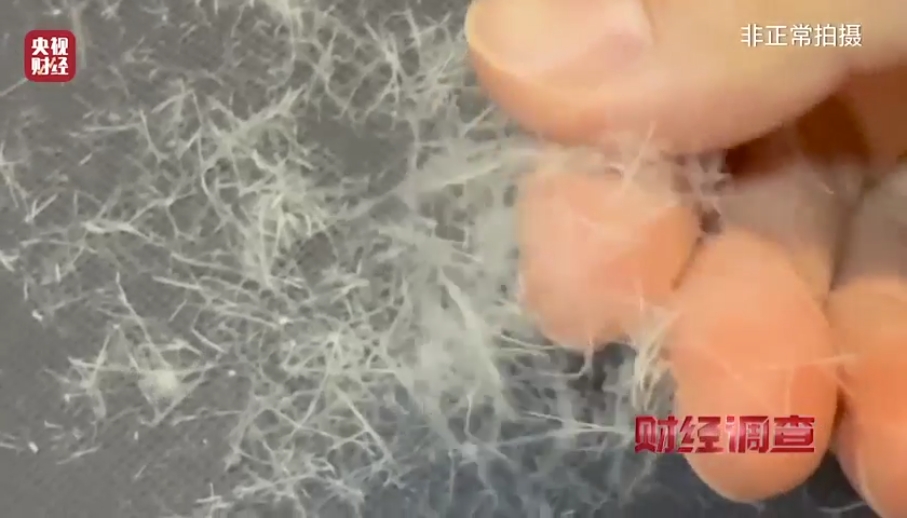 所谓“飞丝”,是指在羽绒加工过程中,从羽毛上脱落下来的单根短丝。由于其形态与羽绒有相似之处,当“飞丝”和“羽绒”被填充进被壳后,无论是从外观看,还是用手直接触摸感受,消费者都极难分辨出二者的差异。