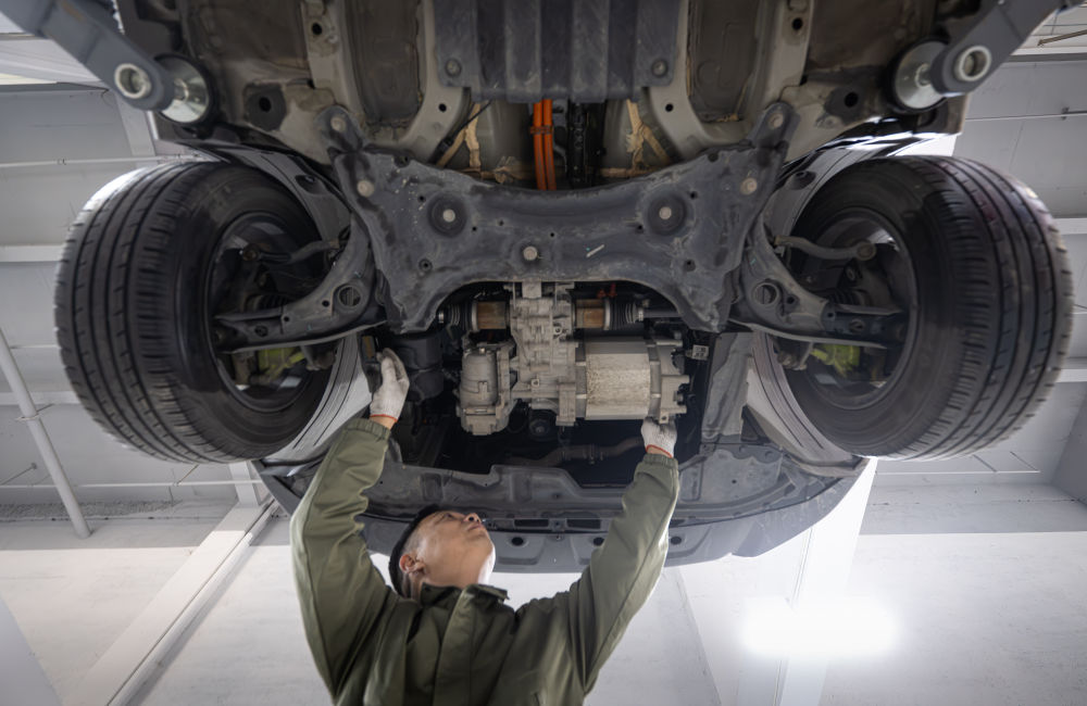 12月5日,一名新能源汽车维修师在检查一辆新能源汽车的电机。新华社记者肖艺九摄